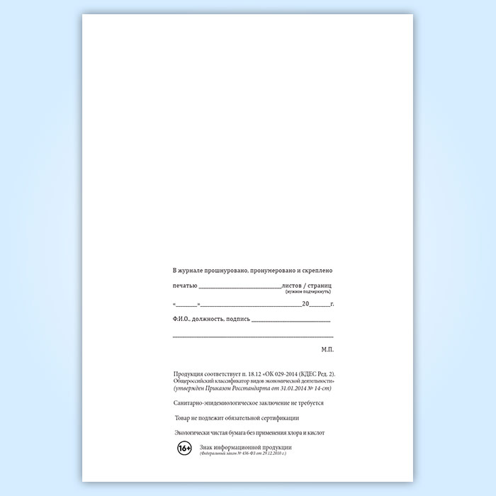 Вы получаете печатную продукцию прошнурованной и c местом для вашей печати в соответствии с действующими нормативными документами: