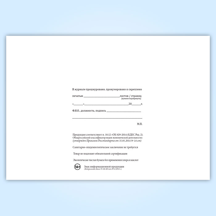 Вы получаете печатную продукцию прошнурованной и c местом для вашей печати в соответствии с действующими нормативными документами: