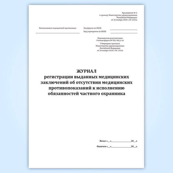 Журнал регистрации выданных медицинских заключений об отсутствии медицинских противопоказаний к исполнению обязанностей частного охранника (учетная форма № 002-ЧО/у-10) в Чите купить