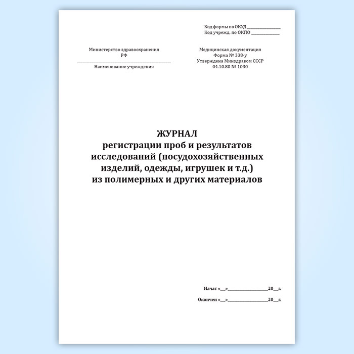 Журнал регистрации проб и результатов исследований (посудохозяйственных изделий, одежды, игрушек и т.д.) из полимерных и других материалов (форма № 338-у) в Чите купить