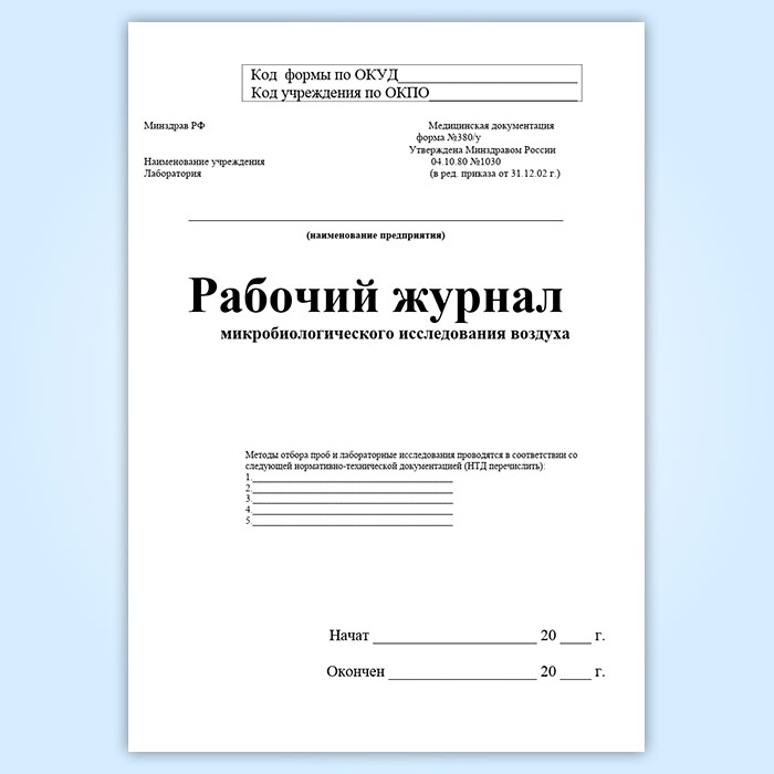 Рабочий журнал микробиологического исследования воздуха (форма 380/у) в Чите купить