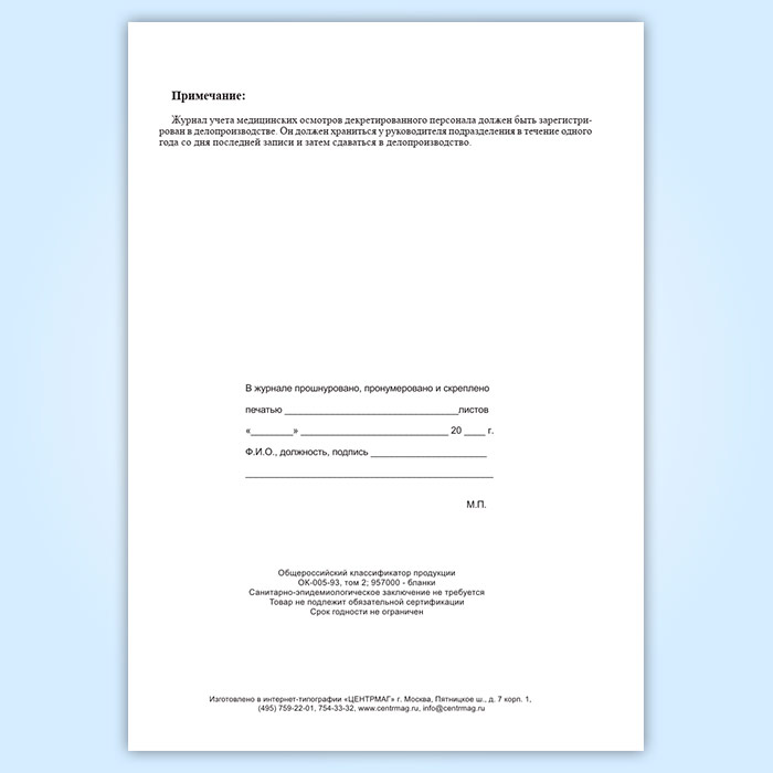 Журнал учета медицинских осмотров декретированного персонала в Чите купить