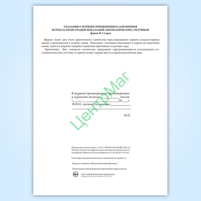 Журнал регистрации показаний автоматических счетчиков (форма № П-3 тара) в Чите купить