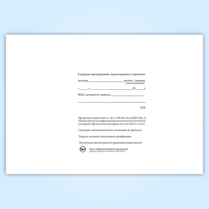 Вы получаете печатную продукцию прошнурованной и c местом для вашей печати в соответствии с действующими нормативными документами: