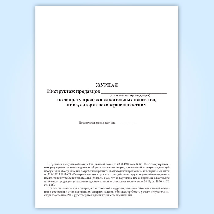 Журнал инструктажа продавцов по запрету продажи алкогольных напитков, пива, сигарет несовершеннолетним в Чите купить