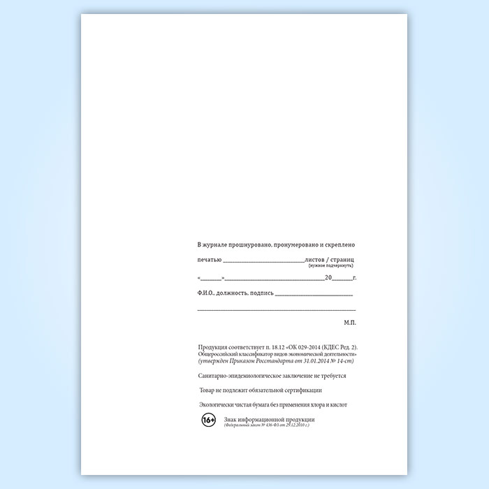 Вы получаете печатную продукцию прошнурованной и c местом для вашей печати в соответствии с действующими нормативными документами: