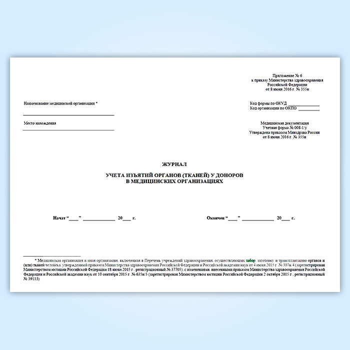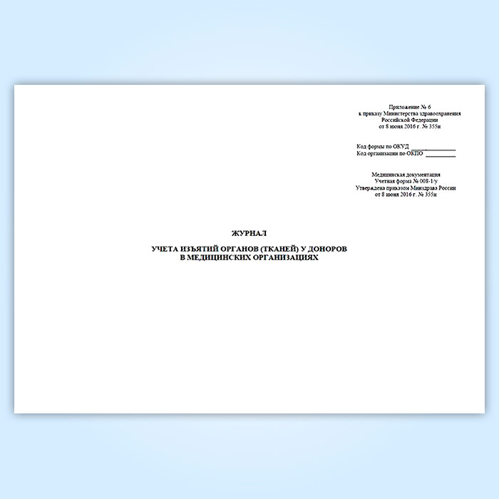 Журнал учета изъятий органов (тканей) у доноров в медицинских организациях (форма № 008-1/у) в Чите купить